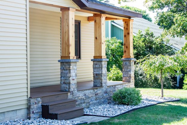 DETAILS: Here, we removed and replaced all the old/damaged siding and decking on this house. Then we installed a few new windows, all new siding, new decking, and did a stone facade on the face of the garage and wrapped around the pillars on the porch. Lastly, we wrapped the top of the pillars and…